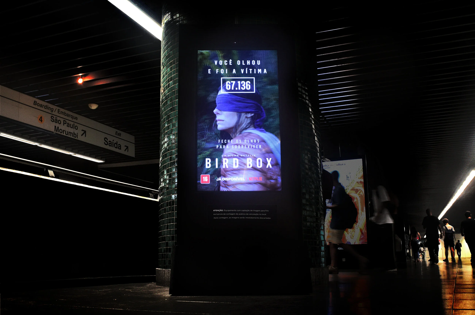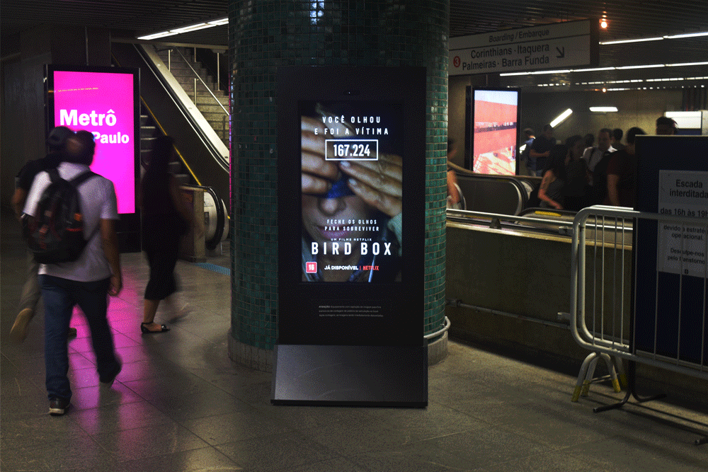 In the Bird Box film, people can't open their eyes because the world is taken over by creatures that somehow manipulate people into killing themselves. To launch the film we made an OOH with a motion sensor, as we passed by, people die. An invitation to enter the world of Bird Box.